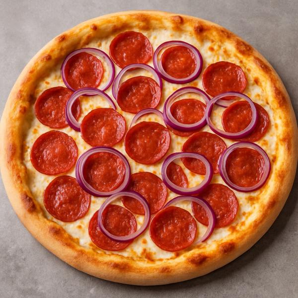 tejfölös alap, szalámi, lilahagyma, mozzarella sajt és trappista sajt mix - 32 cm