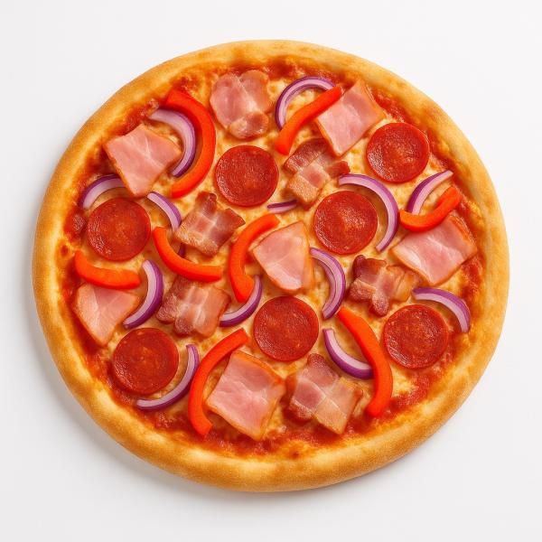 paradicsomos alap, sonka, szalámi, bacon, lilahagyma, kaliforniai paprika, mozzarella sajt és trappista sajt mix - 32 cm